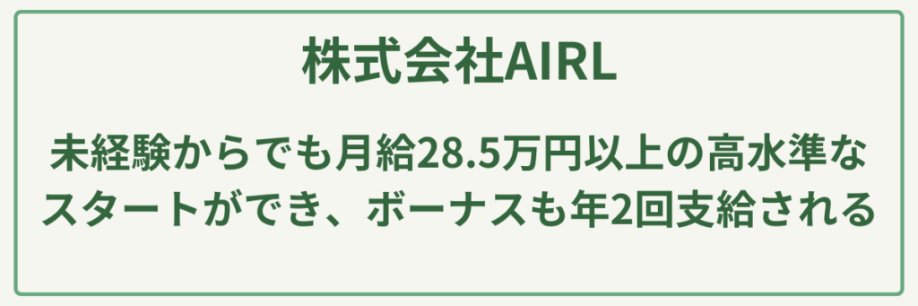 | 給与・報酬 | 月給 250,000円 – 400,000円(昇給年1回、賞与年2回) |
