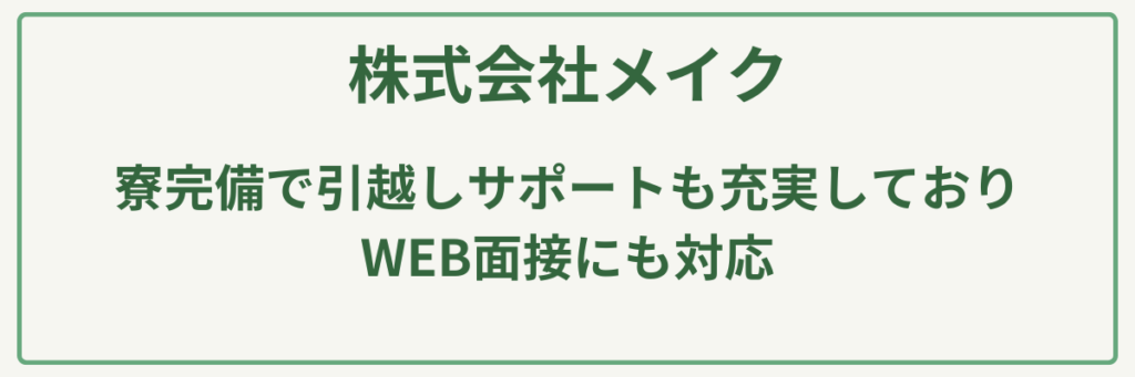 | ポイント | 用保険/労災保険/健康保険/厚生年金/残業ほぼなし/希望休日制度(学校行事等考慮)/寮完備・引越しサポートあり/社員旅行あり(希望制)/職場見学可/WEB面接可 |