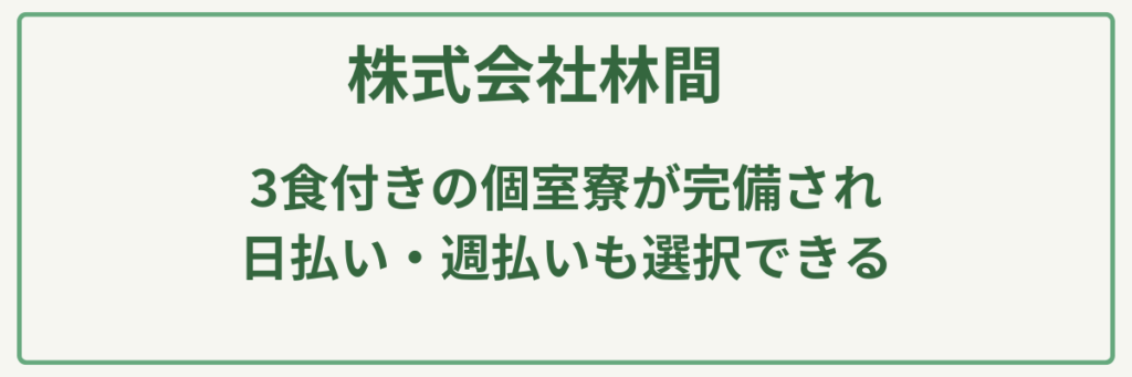 「エアコン・無料Wi-Fi・3食付きの個室寮が完備されている」という特徴があるため、住まいを確保して生活基盤を安定させたい人や、初期費用を抑えて新生活を始めたい人に最適です。