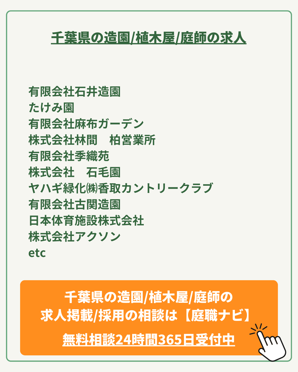 「未経験からでも月給28.5万円以上の高水準なスタートができ、ボーナスも年2回支給される」という特徴があるため、造園業界に挑戦しながらもしっかりと安定した収入を得たい人におすすめです。 また、「『一人一人が主役』というモットーがあり、若手女性社員が自ら事業を立ち上げた実例がある」という特徴があるため、現場作業の枠にとらわれず、自分のアイデアを形にしたりキャリアを切り拓いたりしたい意欲的な人におすすめです。 さらに、「髪型・ひげ・ピアスが自由で、シングルの女性も活躍中、土日休みも相談できる」という特徴があるため、自分らしいスタイルを維持しながら、家庭の事情やプライベートに合わせて柔軟に働きたい人におすすめです。 「現場は千葉中心に関東全域と幅広く、公共から民間まで多様な工事に携われる」という特徴があるため、飽きのこない多様な現場を経験し、着実に造園のプロフェッショナルを目指したい人に最適な環境と言えます。
